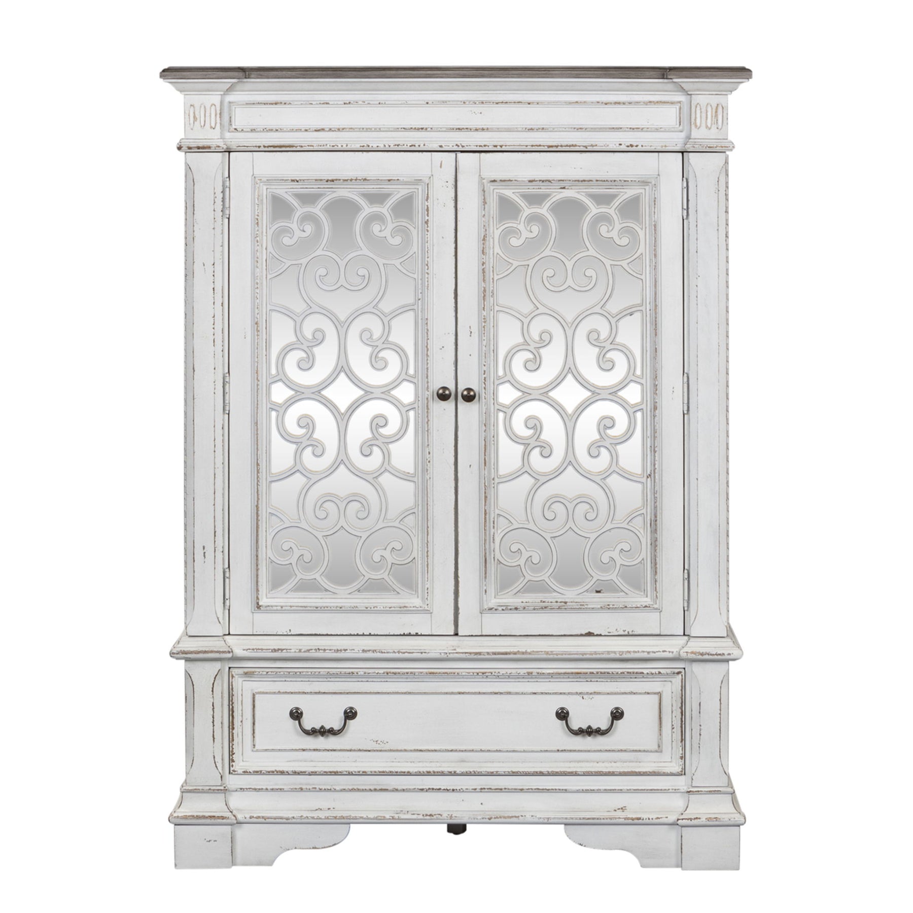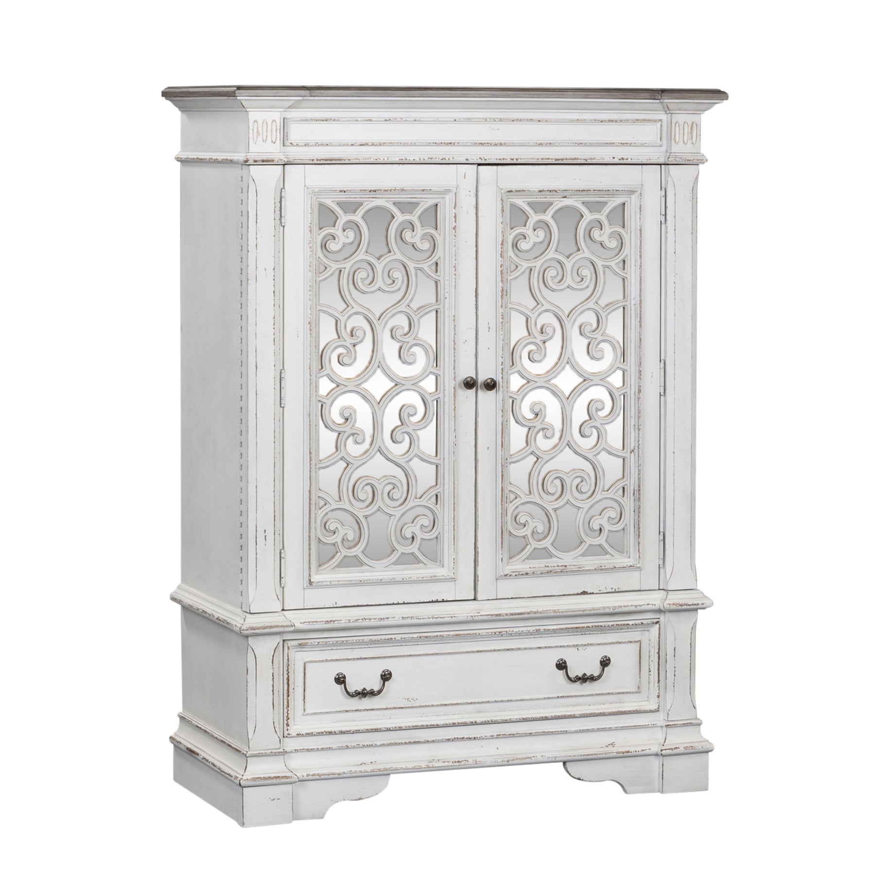 Blending of European traditional design influences makes Abbey Park a truly unique style for any living space. Warm antique finishes and artistic distressing along with grand scale makes Abbey Park a group to be passed to generations. The antique white finish with heavy chipping combines with the weathered brown white wash tops for a truly unique look. Bail and drop ring hardware in antique pewter add the finishing touch to the cases.