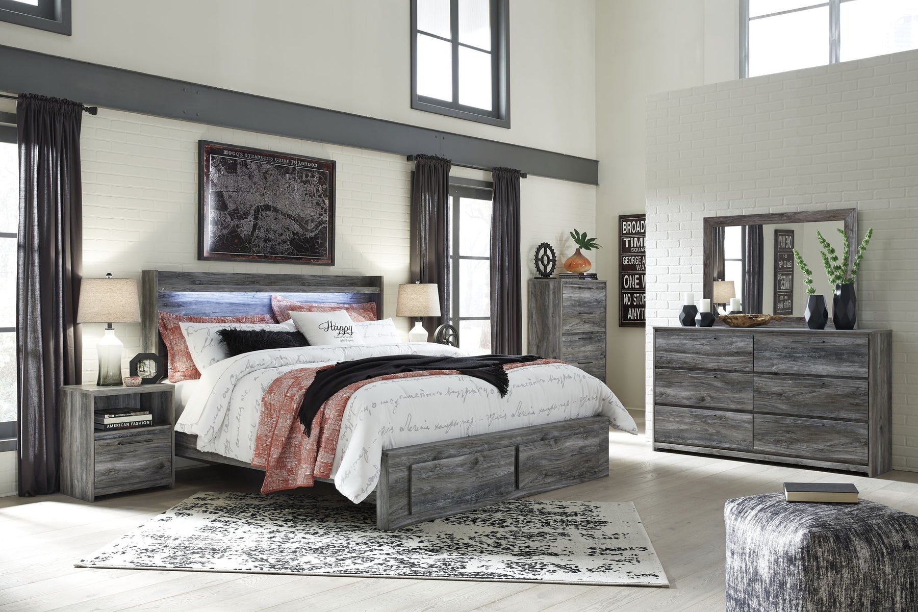Baystorm - 6 Pc. - Dresser, Mirror, King Panel Bed with 2 Storage Drawers - Gray