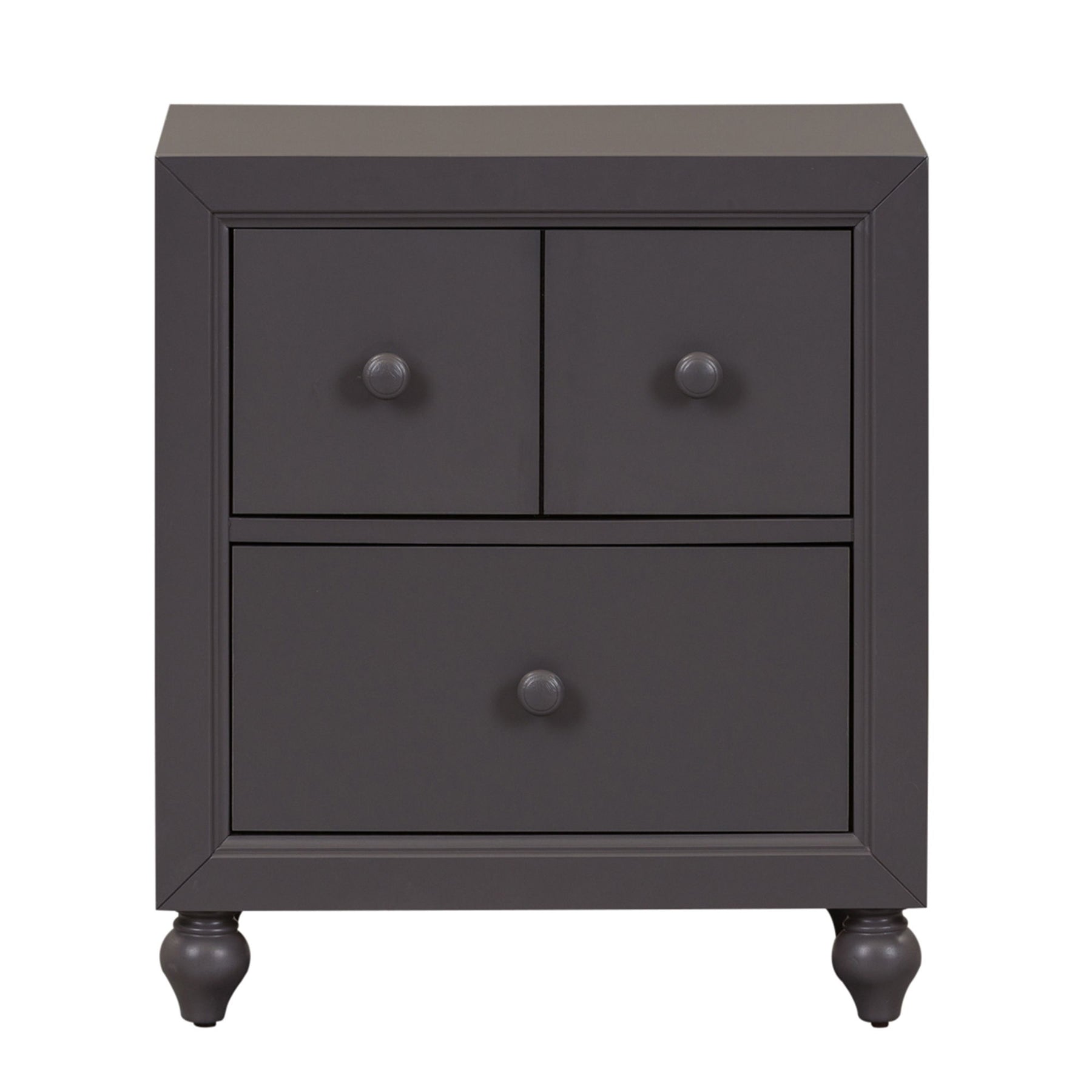 Indulge in cottage design with the Cottage View night stand. Crafted of melamine and a rubberwood solid frame, this piece features a dark grey finish, kenlin drawer glides, laminate drawer interior, bluff cut top drawers, bun feet, bottom case dust proofing, solid wood picture frame moldings, accented by wooden knob hardware, and is available in an alternate finish. Gray works perfectly with different color palettes to design a beautiful youth bedroom.