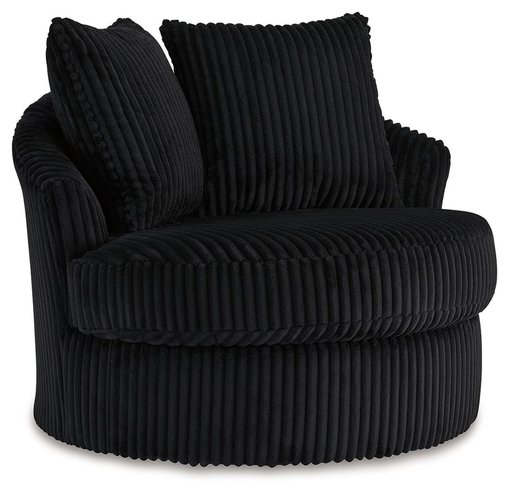 This swivel chair takes style and comfort full circle. Its plush, neutral corduroy upholstery is casually cool and beautifully on trend, while throw pillows elevate the cozy factor. A smooth-gliding 360-degree swivel lets you go with the flow. Come on, you know you want to take it for a spin.