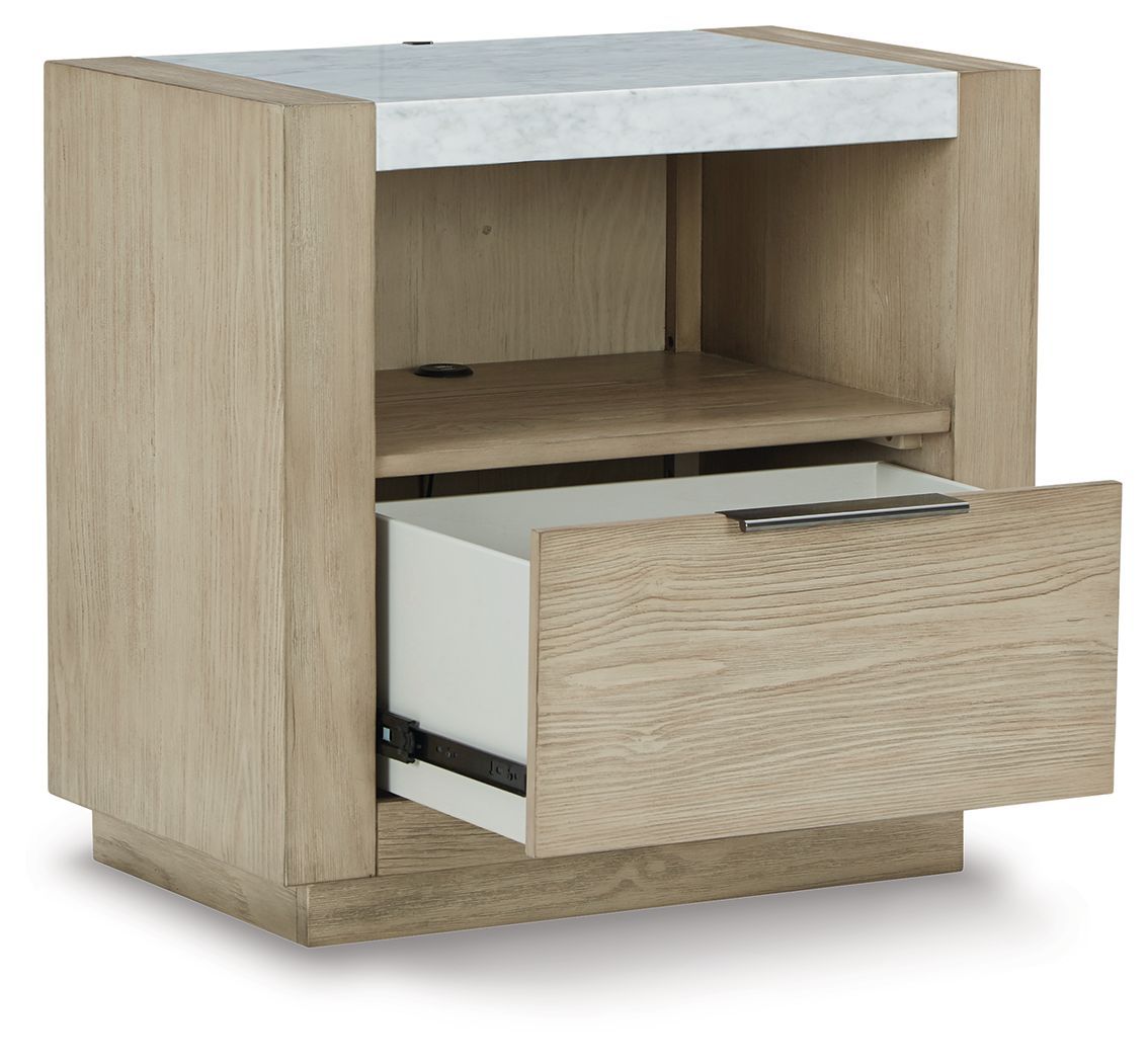 Get the luxe modern look you love at a price you can afford. This nightstand features a structured silhouette on a plinth base that elevates the piece to a modern masterpiece. It has a complex, yet versatile, two-toned look with its natural marble top and textural surface with a bisque coloration. An open shelf and a soft-closing drawer with nickel-tone pull provide just the right amount of storage space. The nightstand marries tech and clean-lined design with its LED night light illuminating the base on three sides. A dual USB charging port within the open shelf area adds extra functionality.