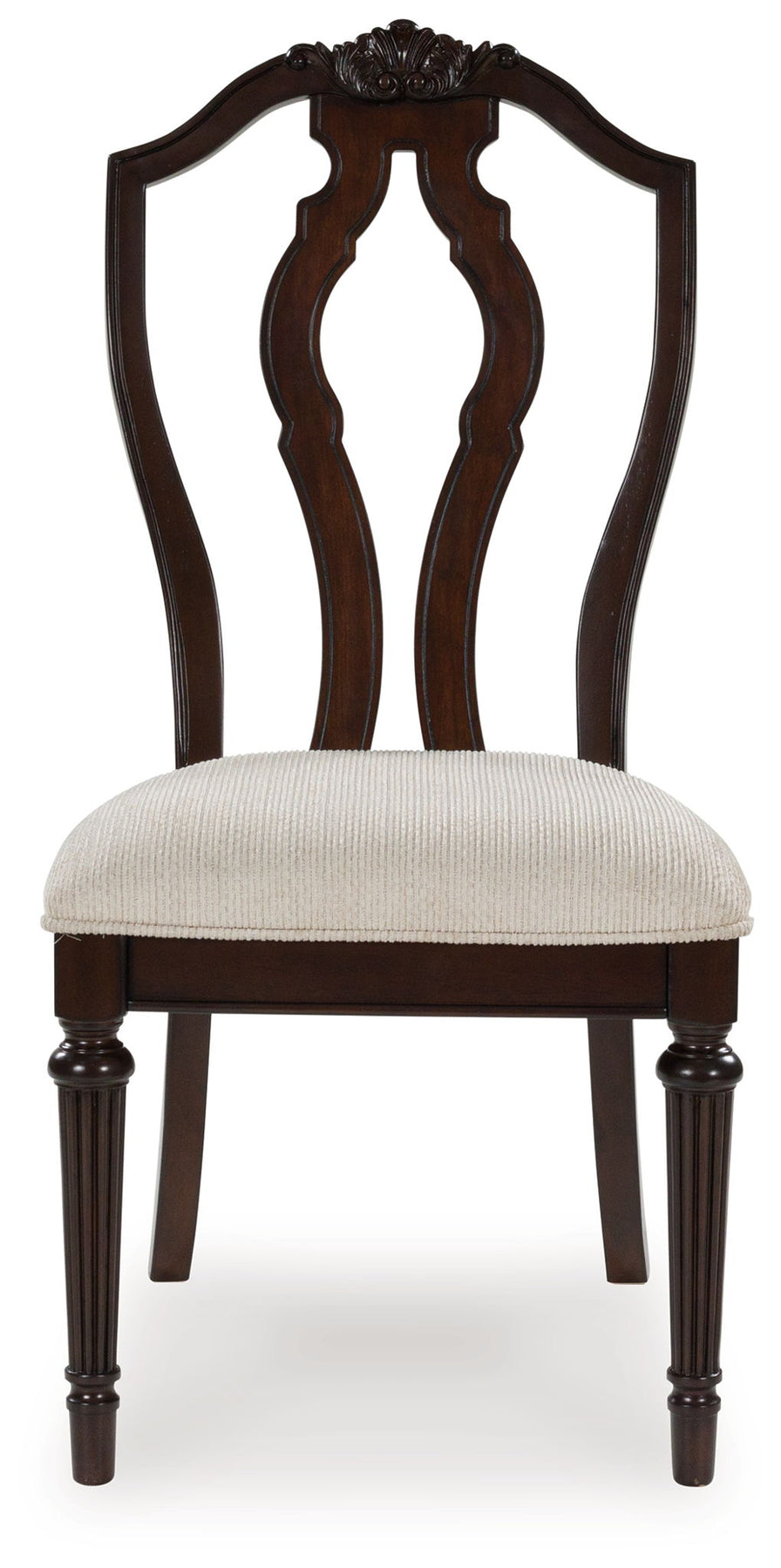 Serve up elegance and poise with this dining chair. Its traditional silhouette is detailed with a stylized back for added opulence. The cushioned seat, crisply tailored in textured tan fabric, provides added comfort. From breakfast to dinner, this chair elevates your dining experience with classic beauty.