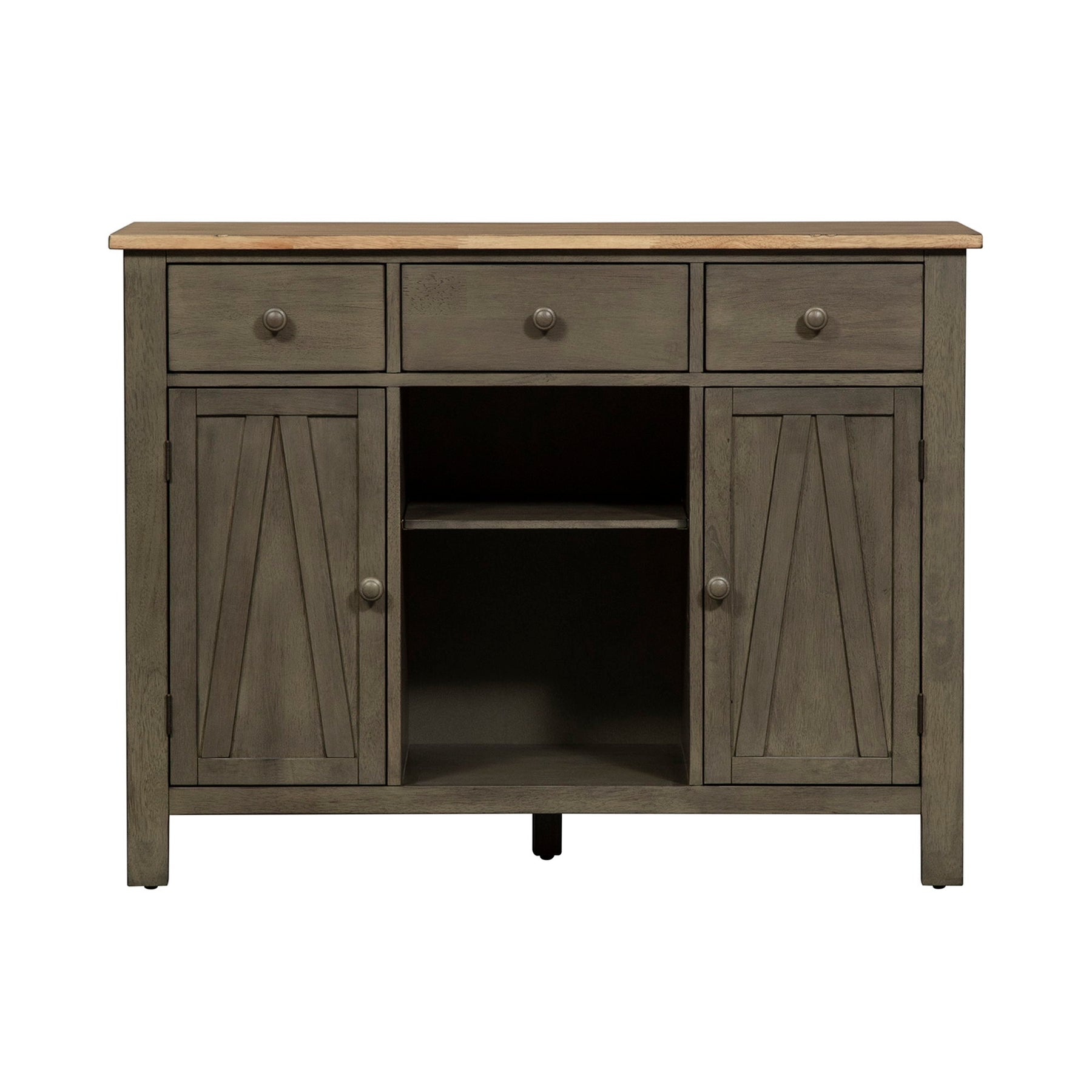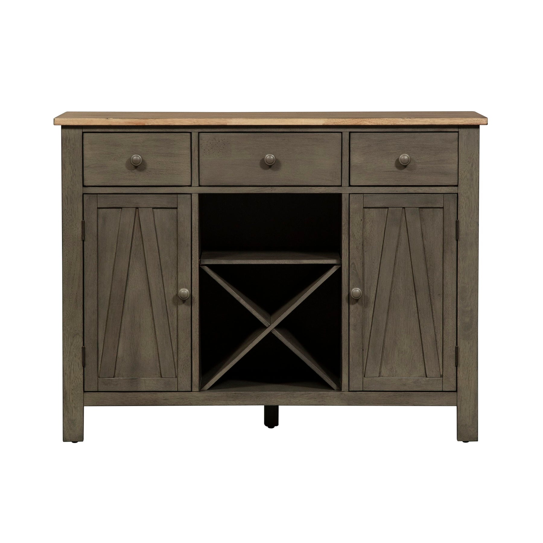 Invite a classic look with a casual feel into your home with the Lindsey Farm server. Crafted of rubberwood solids and veneers with MDF, this piece features inverted v design on both doors, levelers to protect your flooring and adjust the height, three drawers accented with gray wood knob hardware, one adjustable shelf behind each door, and removeable x shaped wine shelving. This piece has an alternate finish and offers a look that compliments today's homes with style uncompromised.