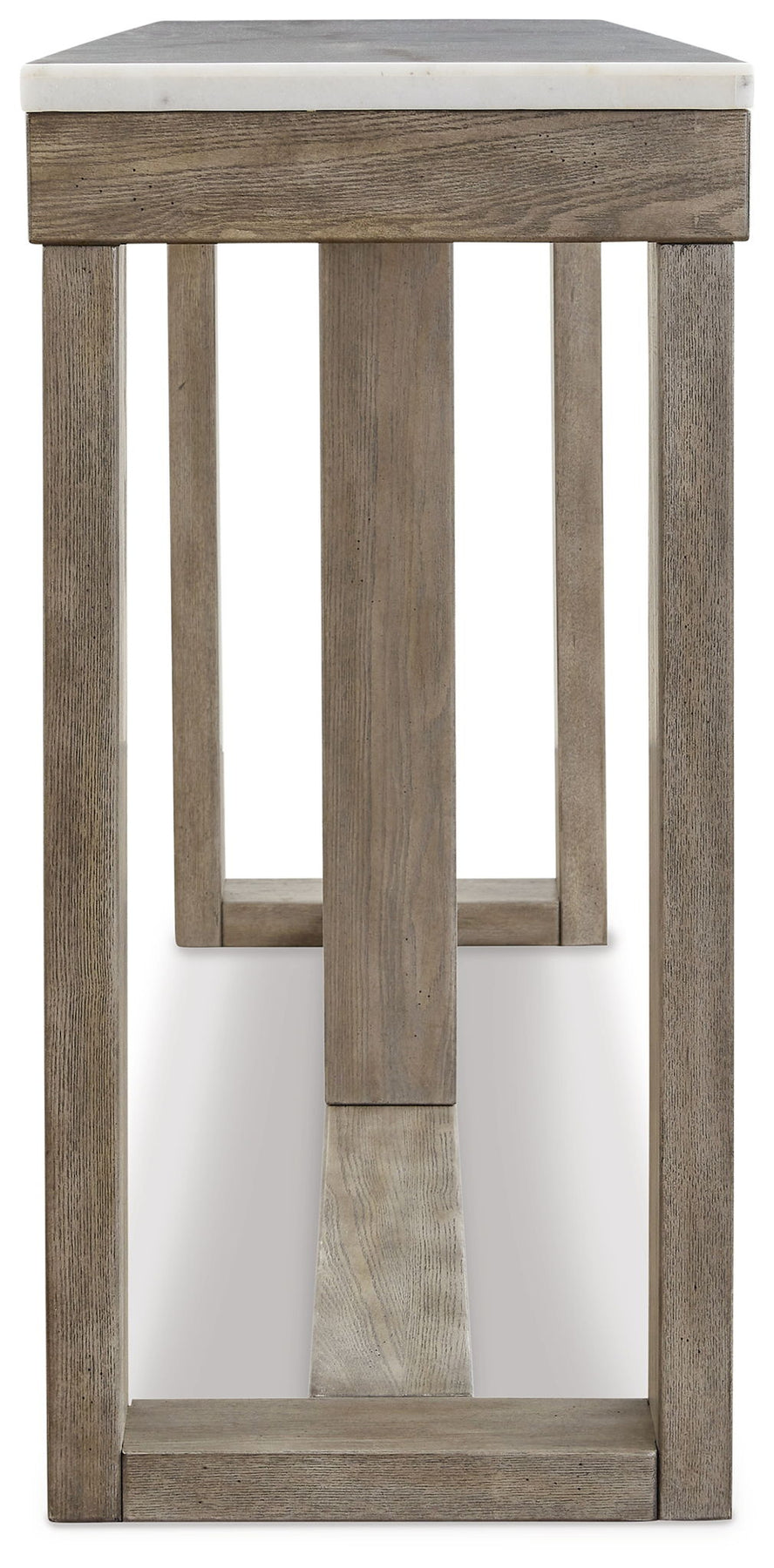 This sofa table is simple in design but big on style. Finished with a trend-right grayish brown wood tone, its bold, blocky profile and natural marble top are timeless, classic choices. This table is ideal for pairing with an ottoman to pull extra seating into the room, or for remaining clean and sleek on its own.