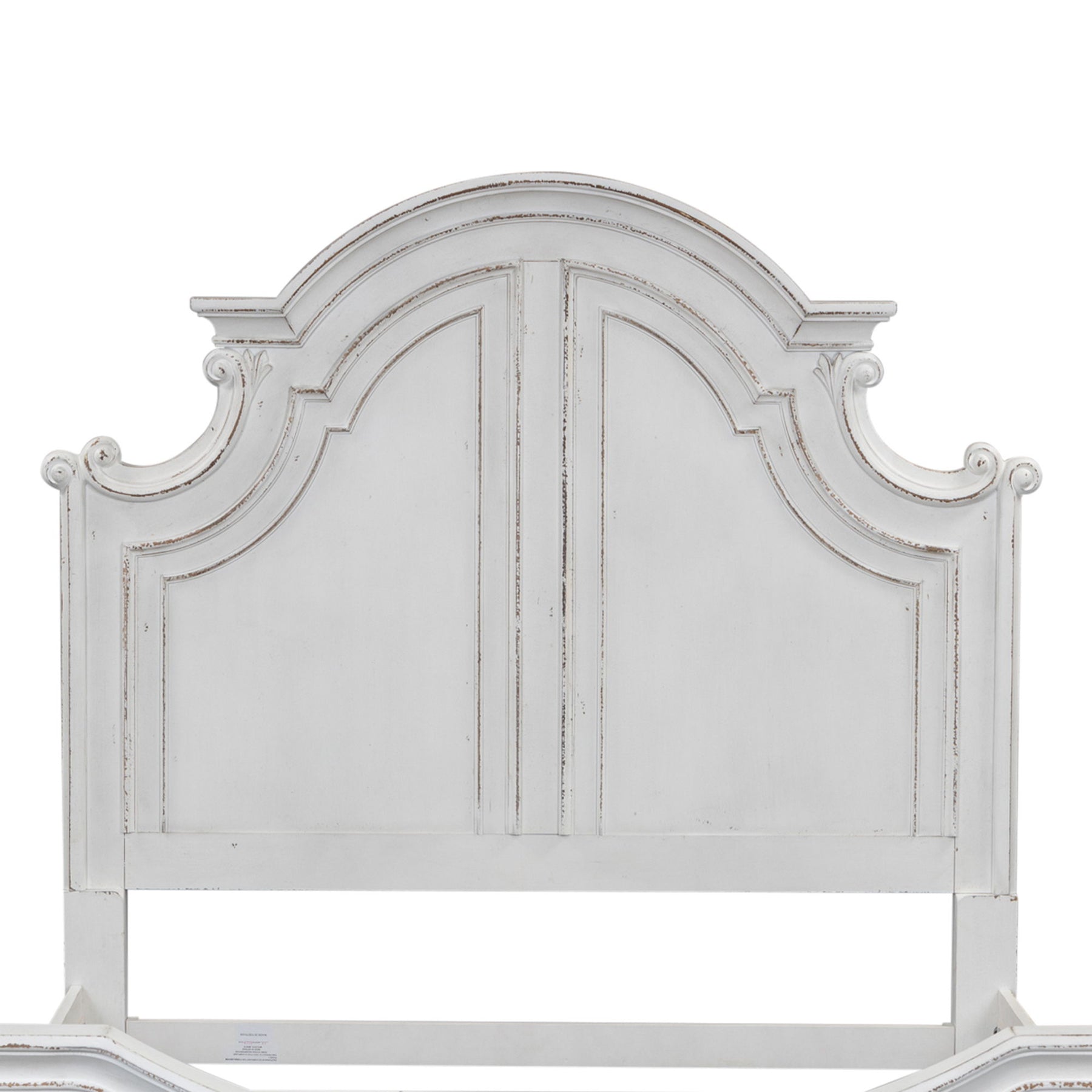 Accent your bedroom with the perfect blend of European Traditional design and casual appeal using the Magnolia Manor Panel Headboard. Finished in a weathered and antique finish with heavy chipping combination this piece is crafted of poplar solids and white oak and birch veneers.The panel headboard features an arched crown with dog bone accents on each corner adding definition and character. The headboard will work with a metal bed frame or the panel footboard and rails.