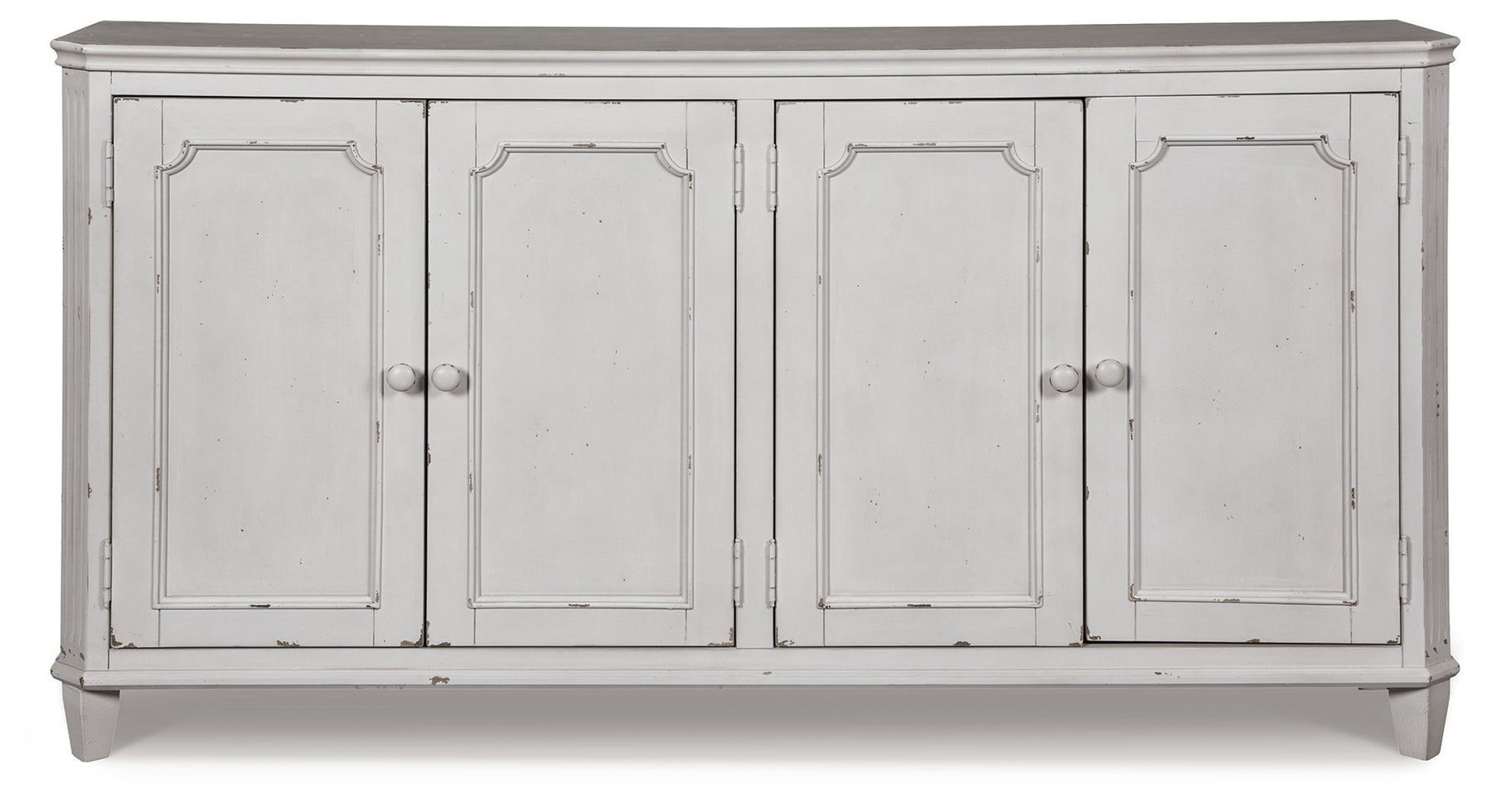 With its distressed vintage paint finish, fluted details and French provincial mouldings, this exquisite cabinet is sure to grace your space in such a très chic way. Adjustable shelved storage is abundantly practical, be it in a dining room, living room or entryway.