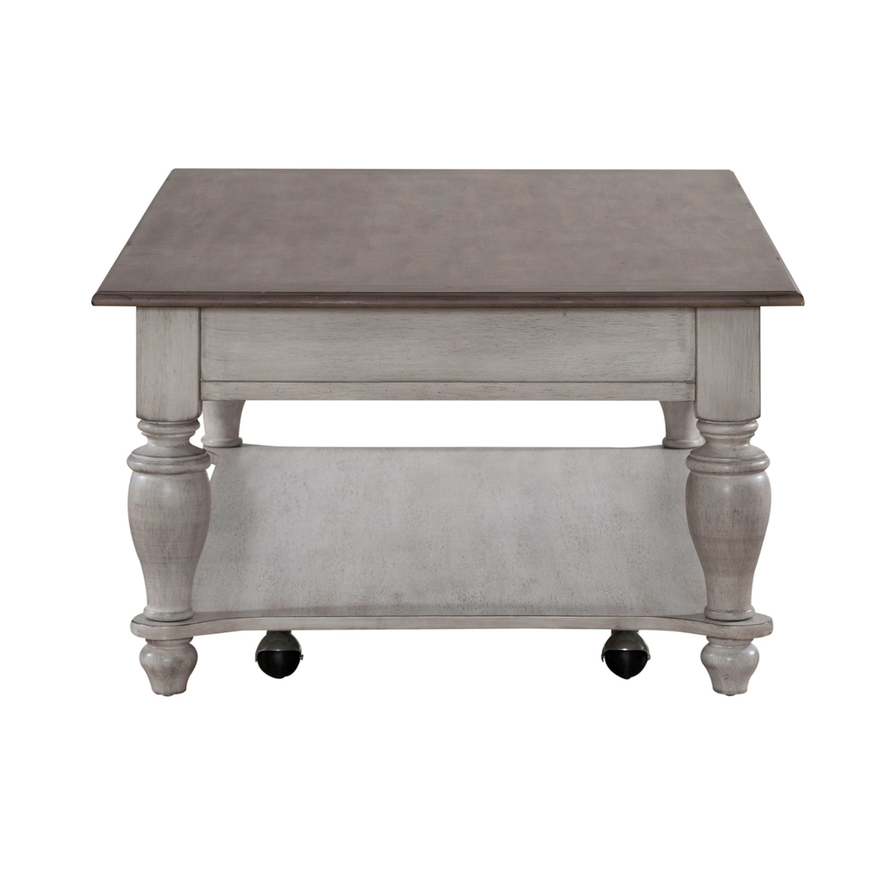 Create a relaxed interior look that works for coastal styles, country, and cottage interiors with the Ocean Isle rectangular cocktail table. Crafted of rubberwood solids and New Zealand pine veneers, this piece features a finish with weathered pine, casters for easy movability, turned legs, and is accented by satin nickel cup hardware. Users can enjoy the convenience of added storage with the bottom shelf, perfect for storing magazines, board games, or extra throw blankets.