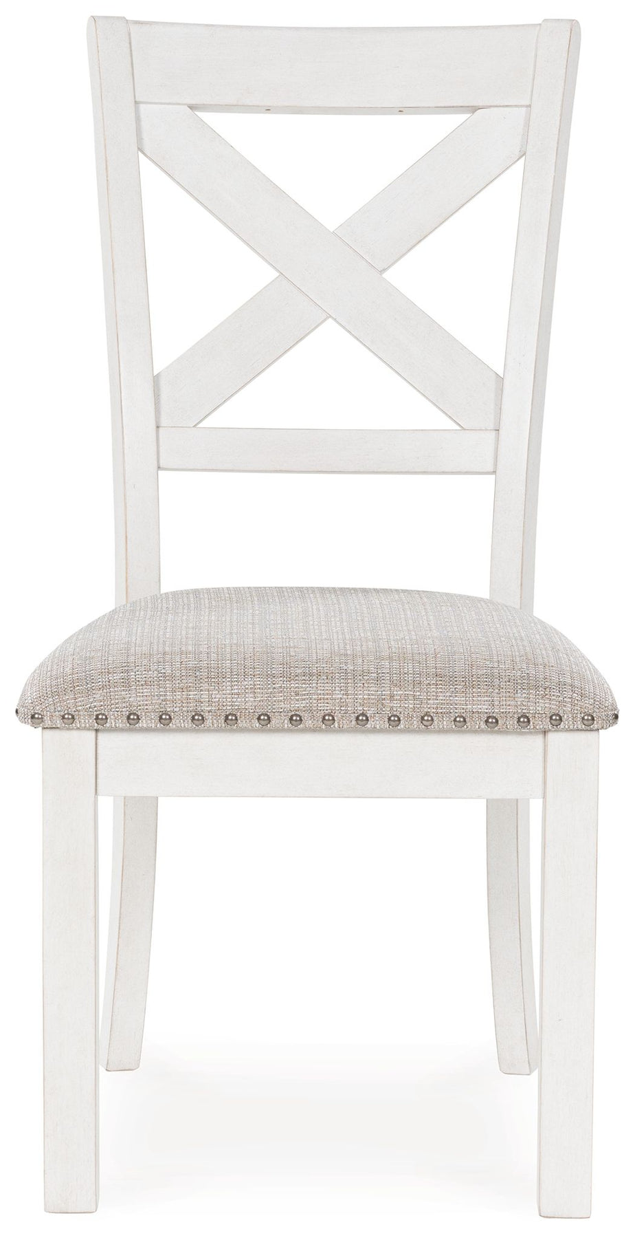 This dining chair is sure to impress come mealtime. With its antiqued white finish, classic country X-back and light gray upholstery with nailhead trim, modern farmhouse-style dining has never been so fashionable. All that's missing is you and your family.
