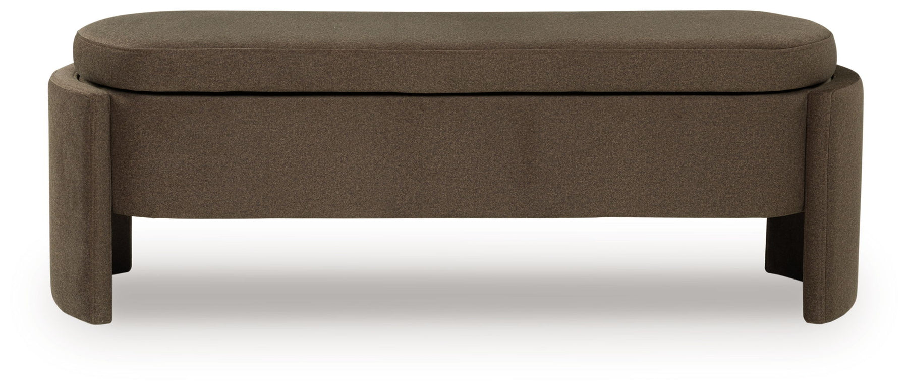 There’s more to this upholstered storage bench than what meets the eye. Its soft heathered brown upholstery provides a comfy sitting area. Lift the hinged seat to reveal lots of storage for pillows, blankets or other essentials. Coupled with its unique capsule shape, this bench is full of form and function.